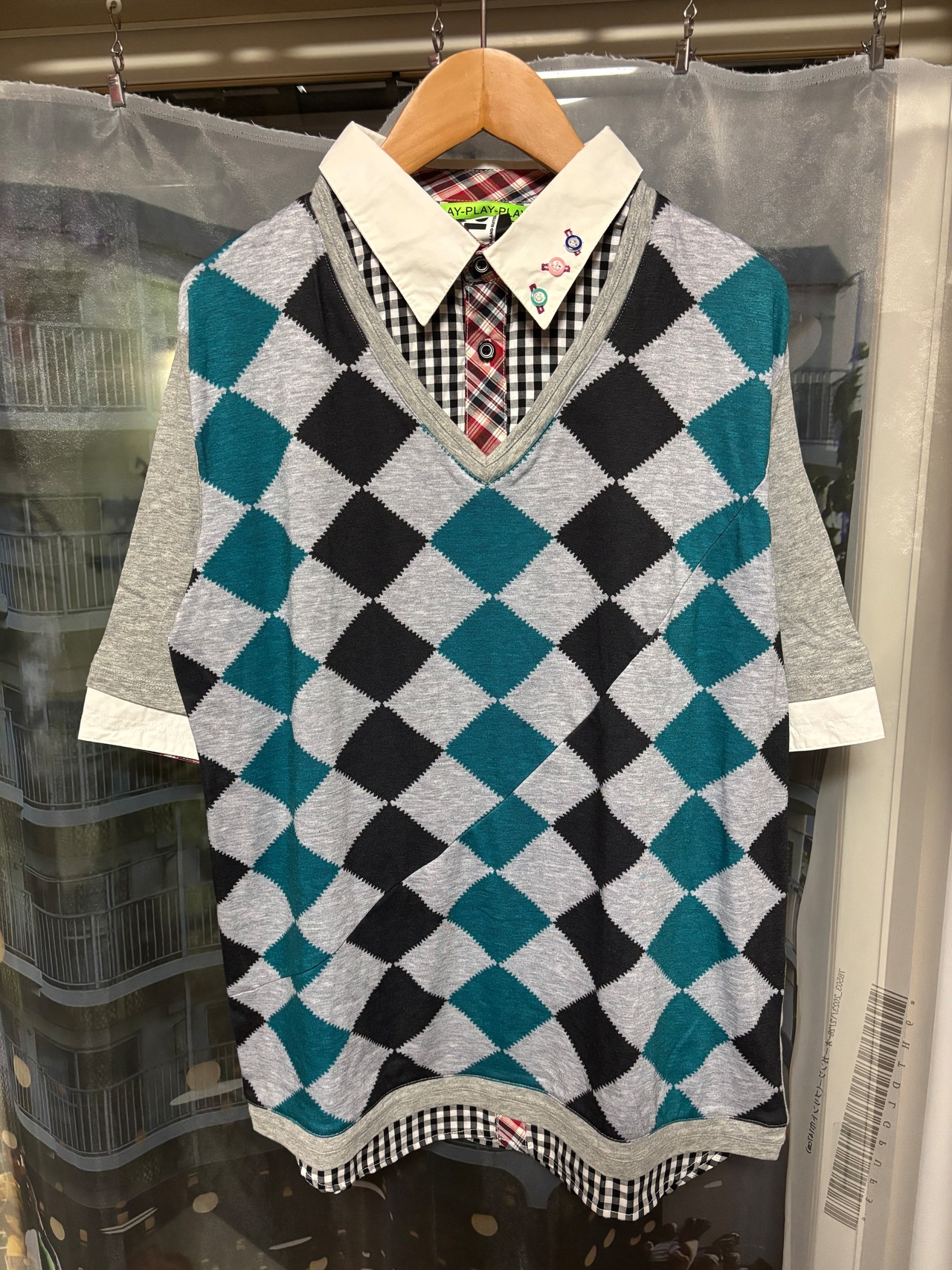 ギンガムチェックのポロシャツに、上からアーガイルベストを着たようなレイヤードが一体化された面白い一着!