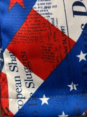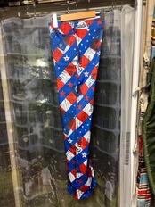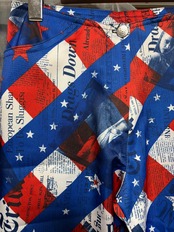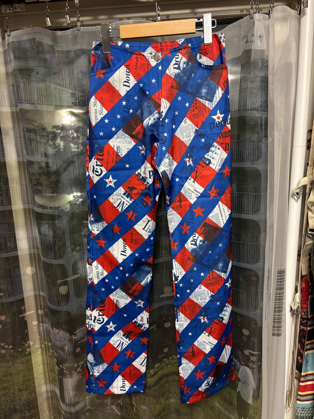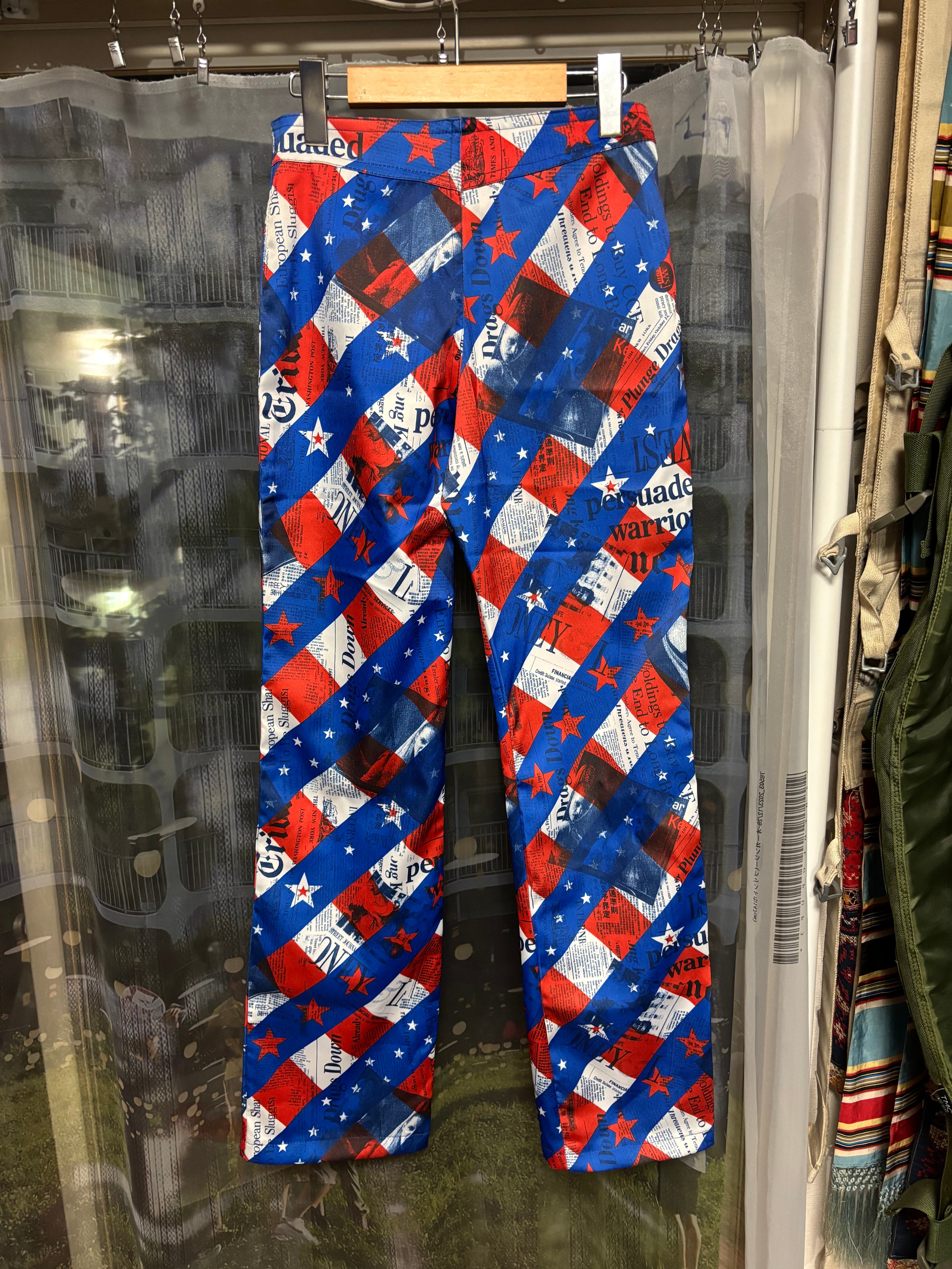 色といい柄といい明らかにUS星条旗柄をモチーフとしているであろう大胆な柄に、近付いてよく見ると1990年代の世界各国の新聞記事がコラージュされてるような面白いパンツ!