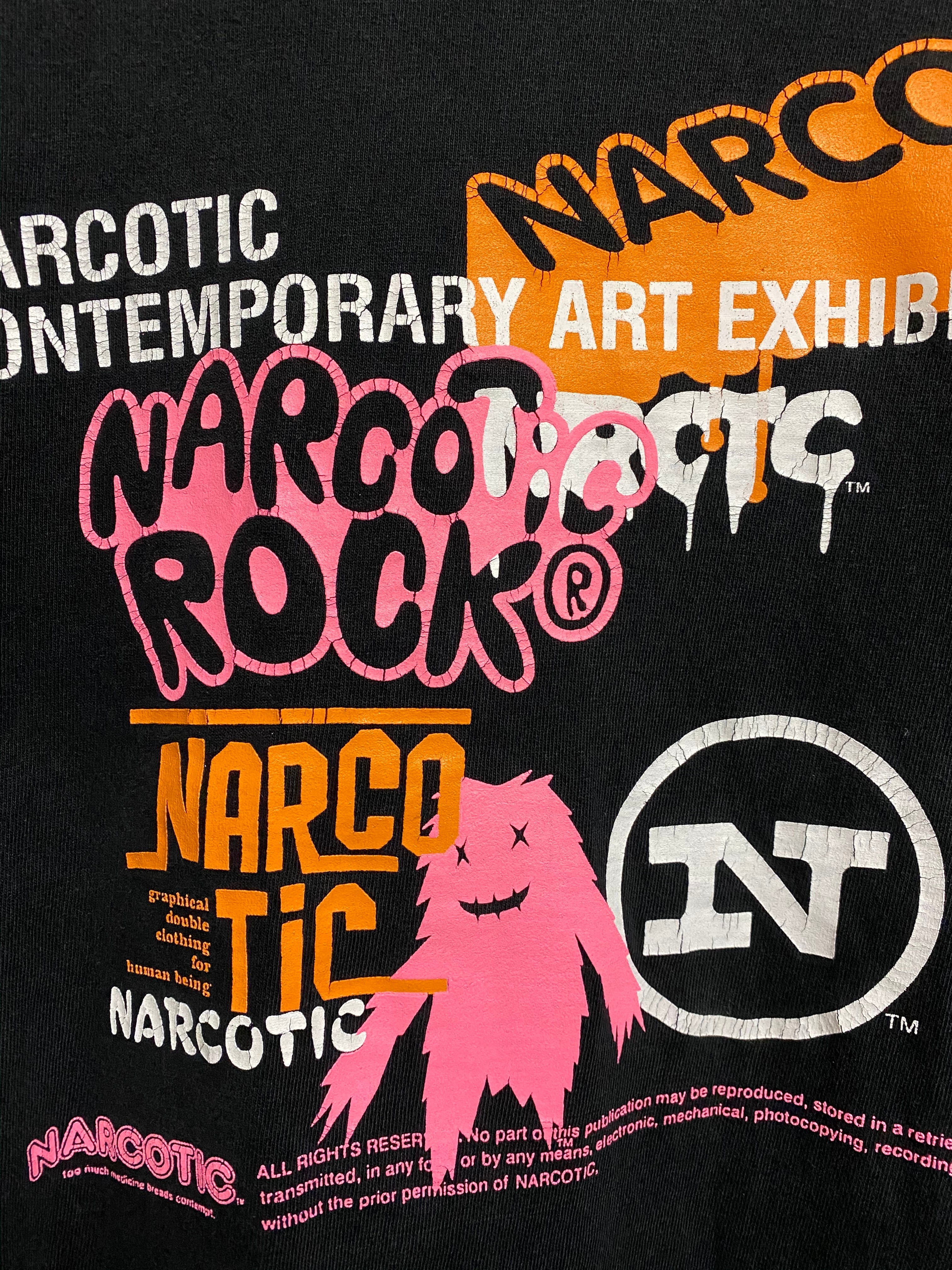Dragon Ash、ゆず、レミオロメン、pre-schoolなどのミュージシャンのCDジャケットデザインを手掛けていた河原光氏の2002〜04年の短い期間で終了したブランドNARCOTICのTシャツ。